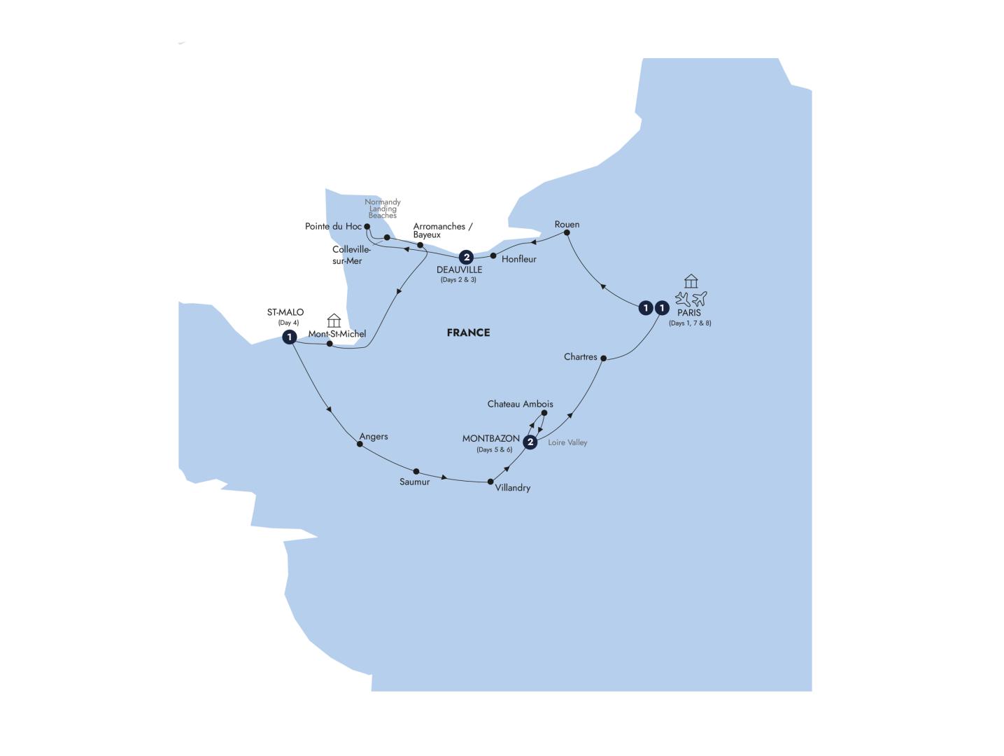 Follow the River Seine to Rouen, capital of Normandy, to admire its ancient cathedral - a masterpiece of Gothic style and the subject of a series of paintings by Claude Monet. Wander through the narrow streets beneath the Great Clock to the Old Market Square. Here, a superb modern church memorializes the burning of Joan of Arc on this very spot in 1431. Continue to the charming fishing town of Honfleur and wander along the harbor or stroll through the colorful streets. Close by, visit a family-owned apple farm for apple juice, cider and calvados tasting. Later, arrive at your luxurious hotel, located in the chic seaside resort of Deauville.