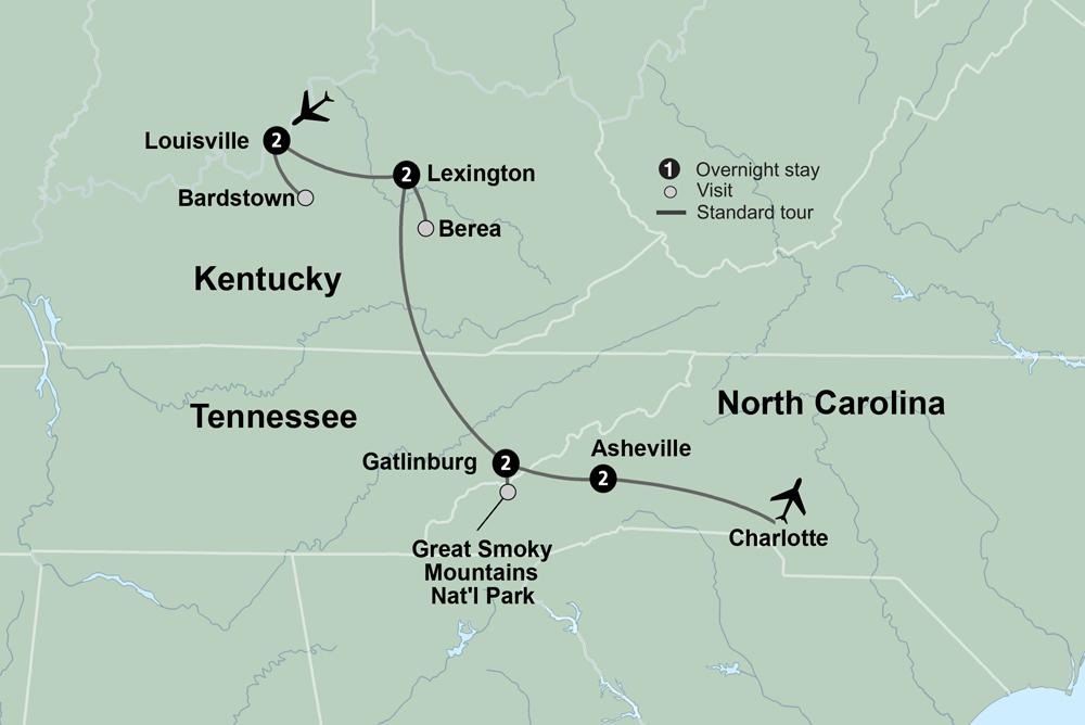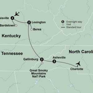 Take a delightful trip through the heart of Appalachia, discovering the equestrian culture of Kentucky, the pioneer spirit of Tennessee, and the mountainous beauty of North Carolina. Get a taste of the spirit of Kentucky through Louisville and Lexington, where bourbon flows, baseball legends are born, and Thoroughbreds reign supreme. Travel through Daniel Boone National Forest as you make your way to Gatlinburg, Tennessee. From your home base of Gatlinburg, explore the natural wonders of Great Smoky Mountains National Park. Travel on to Asheville, North Carolina, and enjoy the city's historic architecture, engaging neighborhoods and robust arts districts. Tour the Biltmore Estate, George Vanderbilt's "little mountain escape" in the Blue Ridge Mountains. When you leave, you'll have the warmth and charm of southern Appalachia still in your heart.